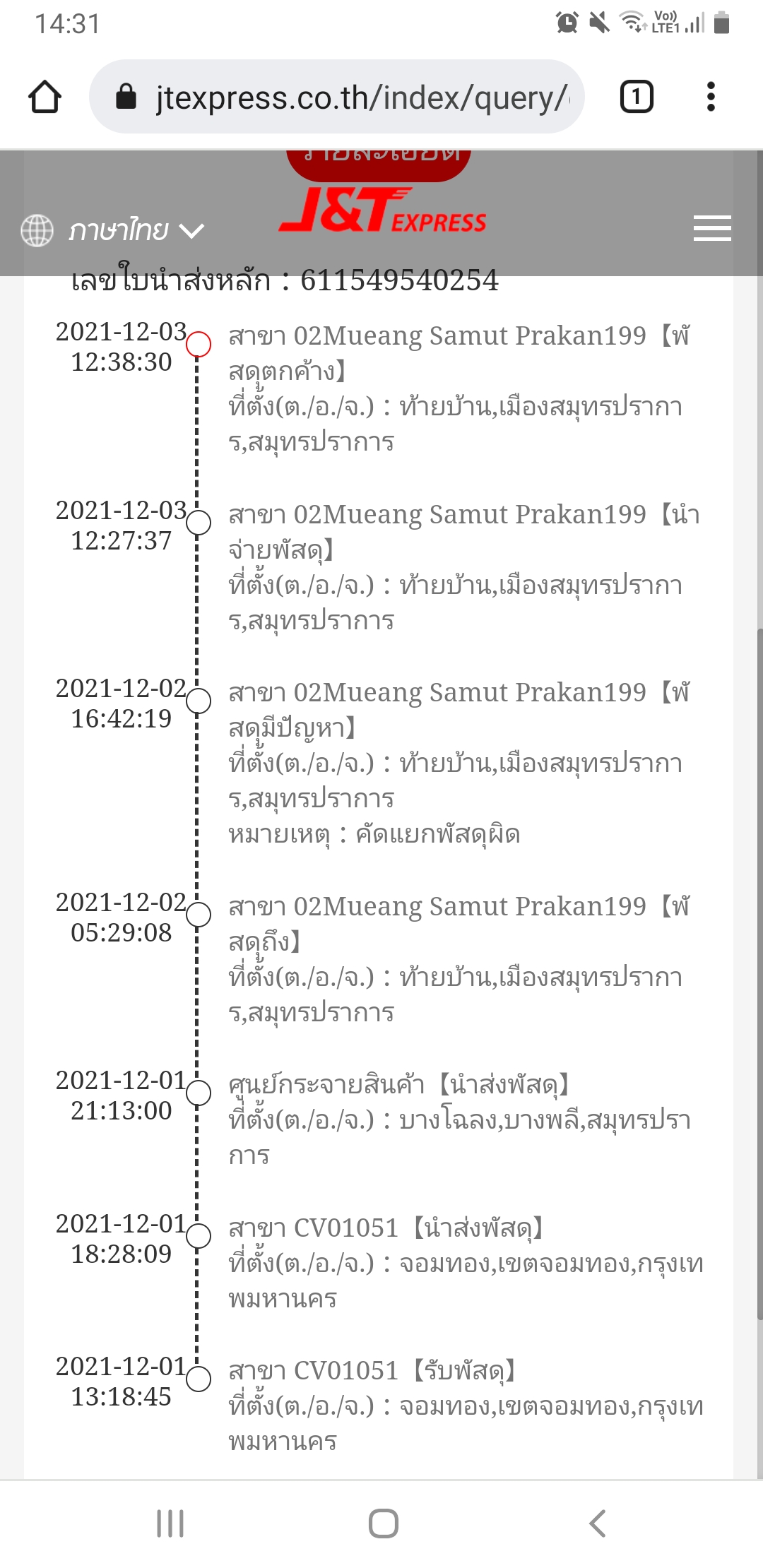 คือผมเป็นผู้รับของ ทางคนส่งเขาส่งตั้งแต่29/11/64 พัสดุถึงสาขาที่ผมอยู่30/11/64 ยันวันนี้3/12/64 ของตกค้างมา3วันแล้วไม่ขยับเลย เบื่อมาก ติดต่อคอลเซ็นเตอร์ทุกวันก็ได้แต่คำตอบเดิมๆ บอกทางสาขาจะติดต่อกลับ