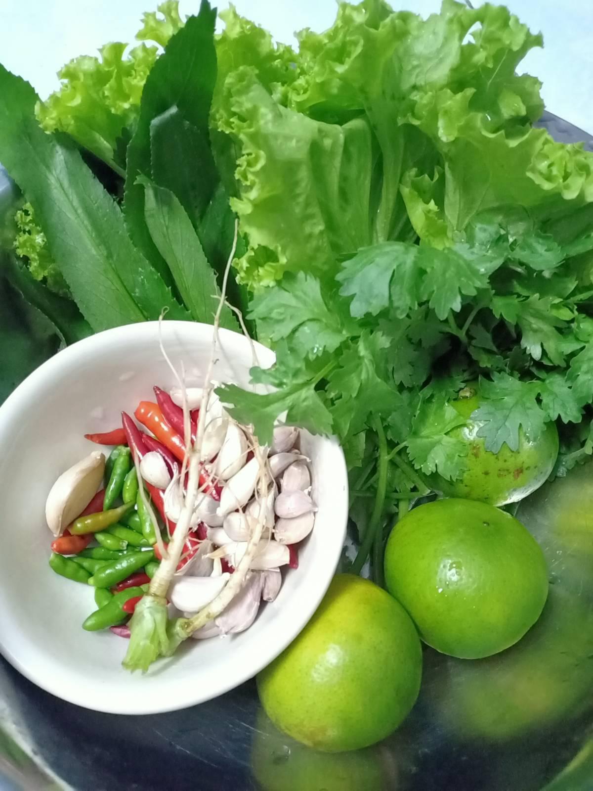 แล้วก็หั่น ทุกอย่าง พริกกระเทียม มะนาว ปรุงในชาม แบบนี้ค่ะ