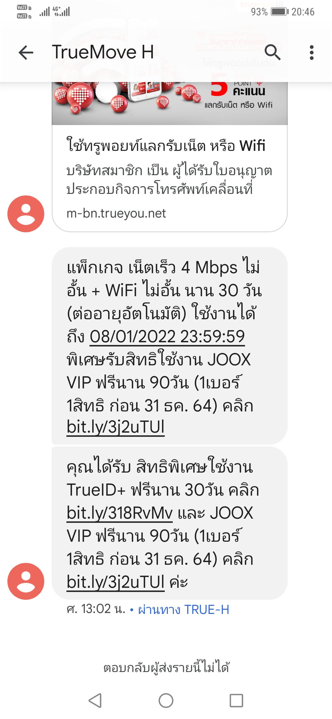 ของทรูมูฟเอช เติมเงินเพื่อตัดแพคเกจเนต ซึ่งตัดได้ปกติมาตลอด และไม่มีข้อความมาบอกว่าจะสิ้นสุดถ้าไม่สามารถตัดเงินได้ พอดีเมื่อคืนลืมเติมไว้ทำให้ระบบตัดไม่ได้ ตื่นมาเข้าห้องน้ำตอนตีสามกว่าๆเลยเห็นข้อความ