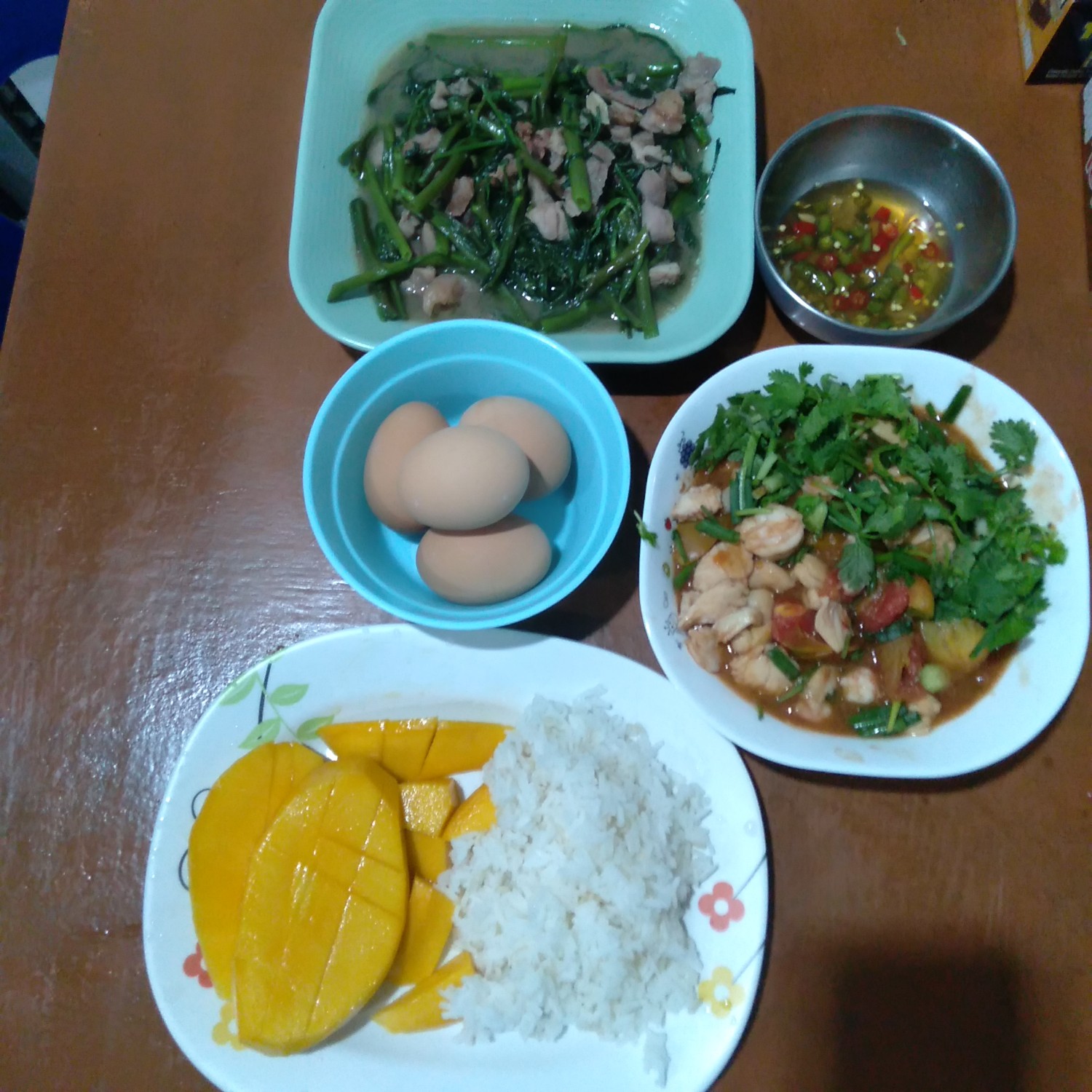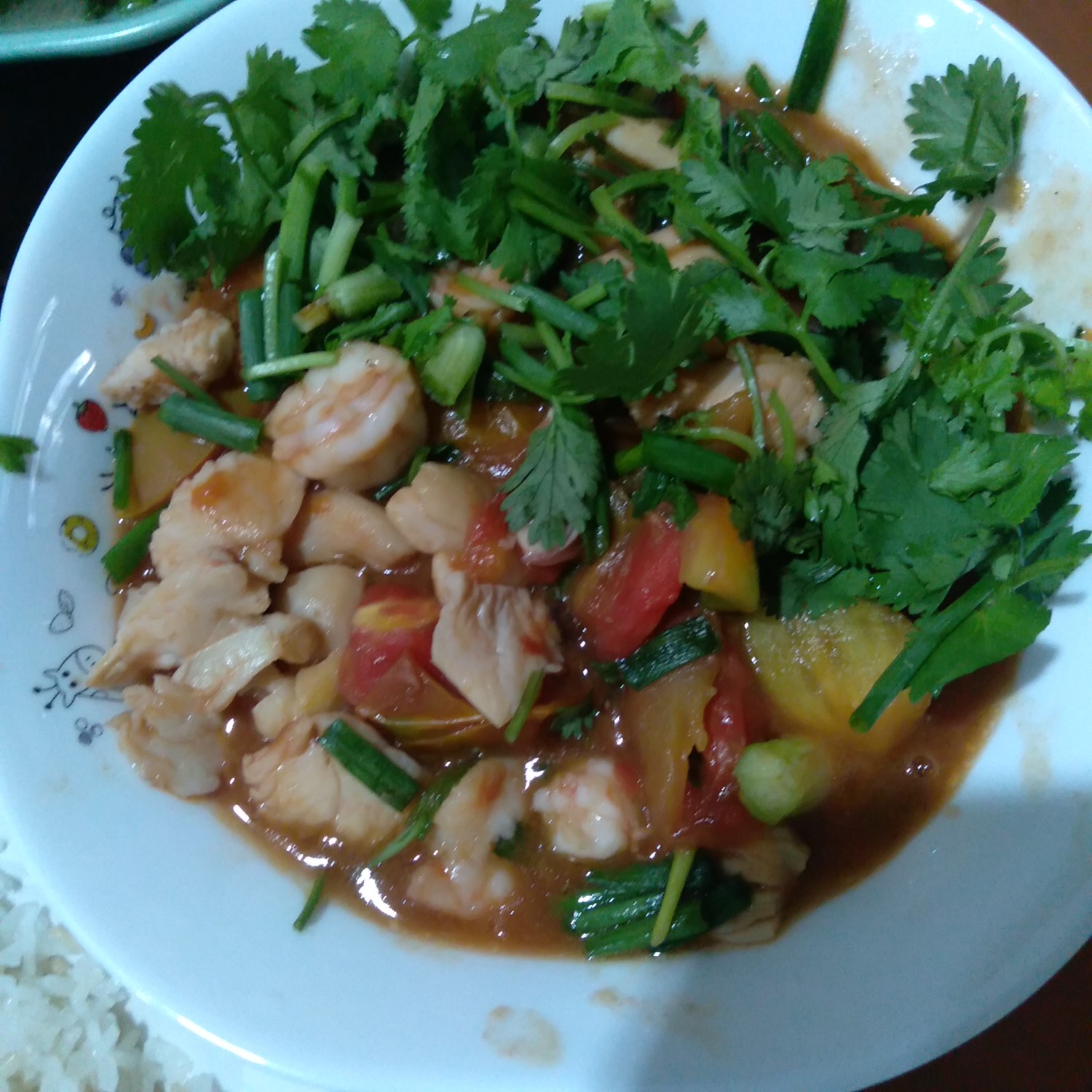 - ผัด BBQ ไก่ กุ้ง มะเขือเทศ ต้นหอม ผักชี