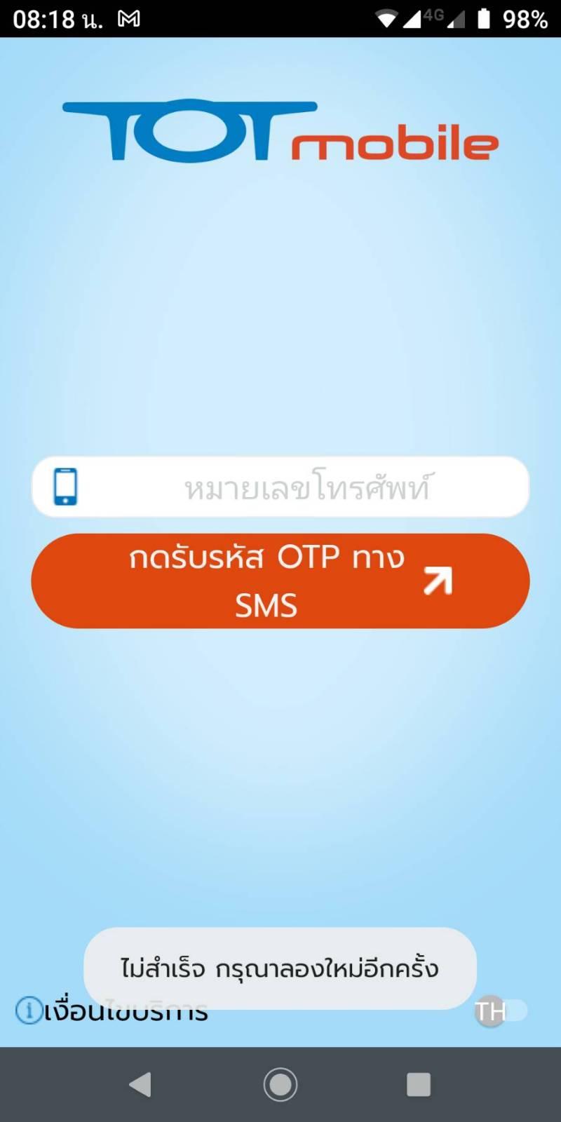 เปิดแอปมาขึ้นแบบนี้ตลอด ใส่เบอร์แแล้วจะเอา otp ก็ขึ้นข้อความแบบเดียวกัน