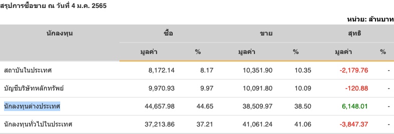 Sinthorn Summary : 4/1/2565 : ต่างชาติซื้อสุทธิ 6,148.01 ลบ.