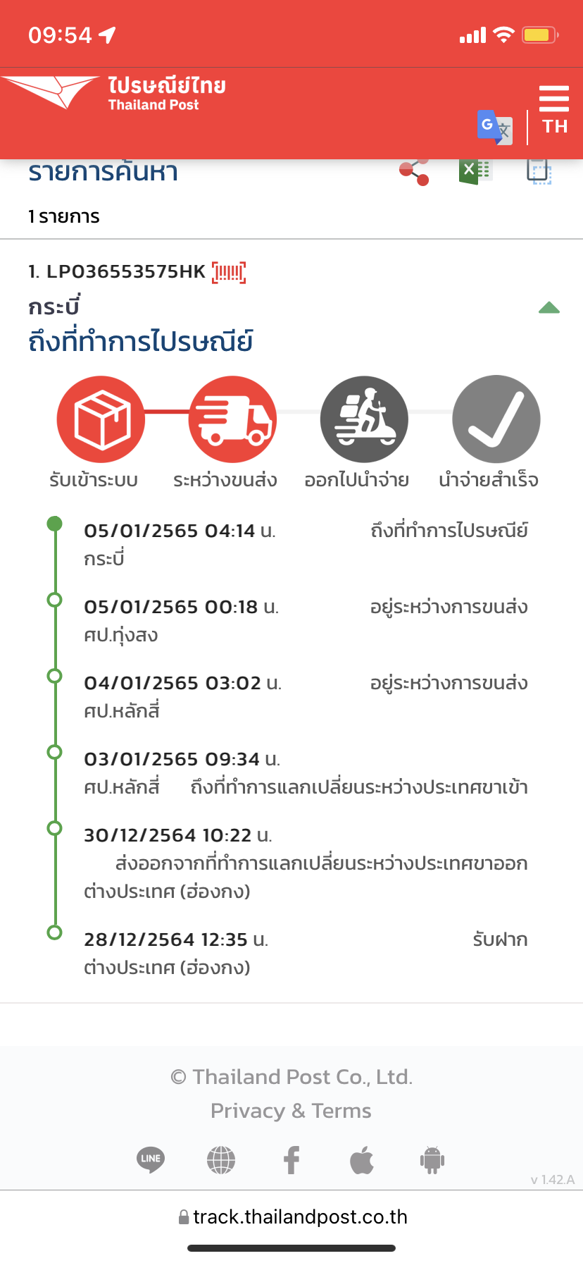 1. EI439271481TH บ้านส้อง ถึงที่ทำการไปรษณีย์ 10/12/2562 07:32 นถึงที่ทำการไปรษณีย์บ้านส้อง 10/12/2562 01:46 นอยู่ระหว่างการขนส่งศป. ชุมพร 09/12/2