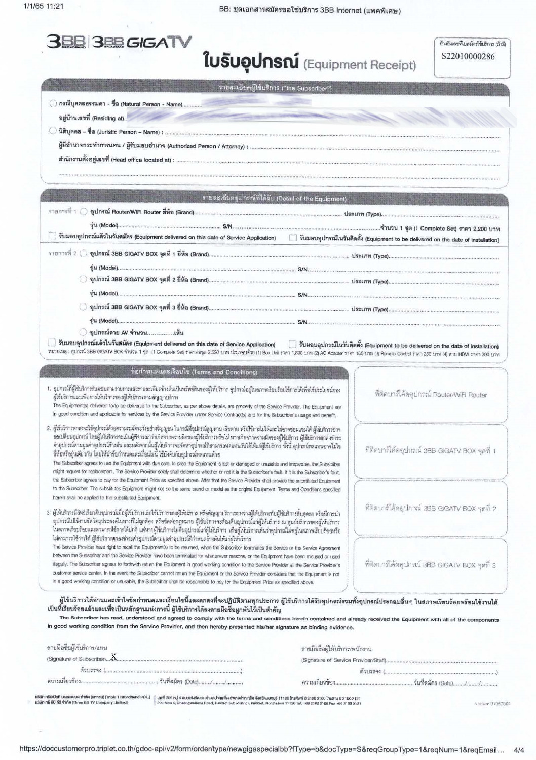 เอกสารใบรับอุปกรณ์ของ 3BB