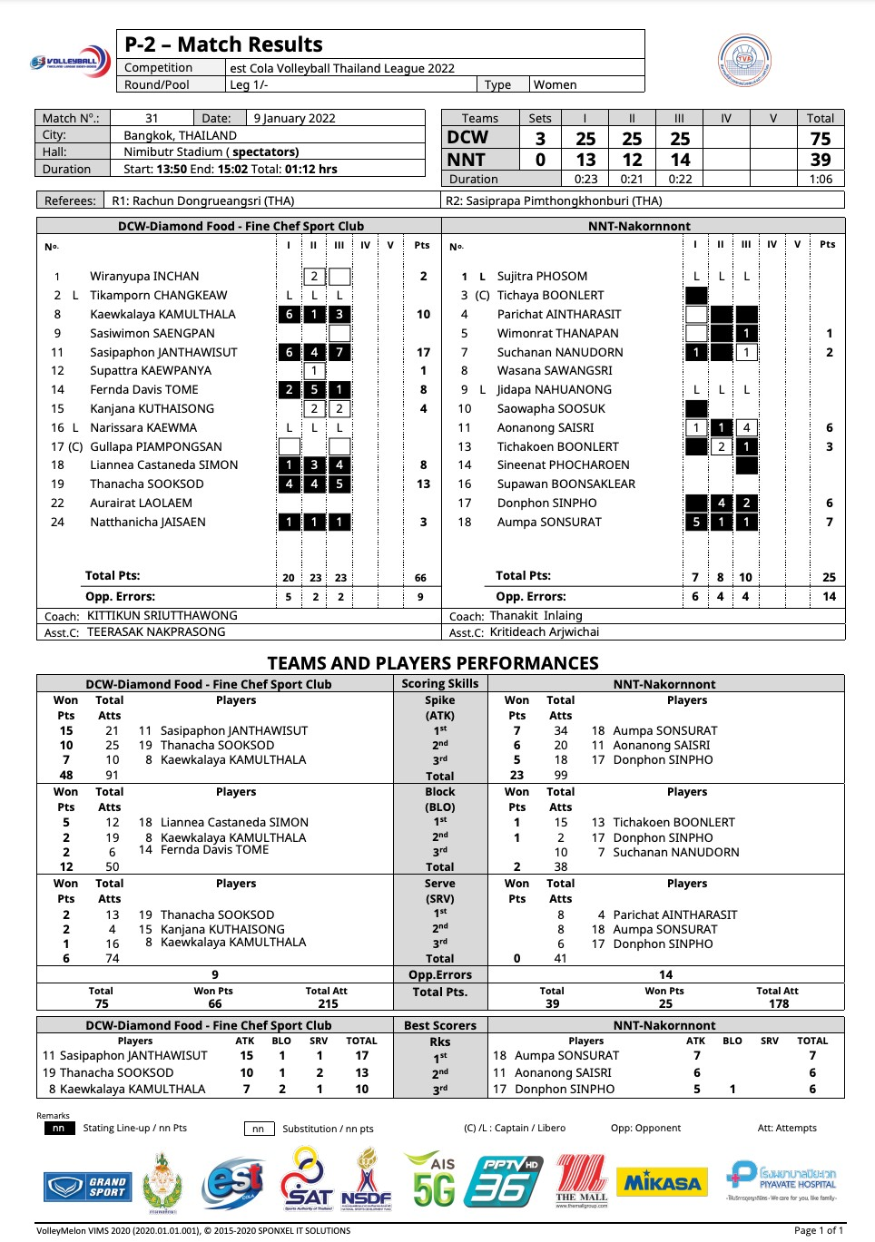 [ประจำวันที่ 23/01/65 ปิดเลก1] ใบคะแนนสถิติ P-2 (ทีมหญิง) วอลเลย์บอลไทยแลนด์ลีก 2021-2022