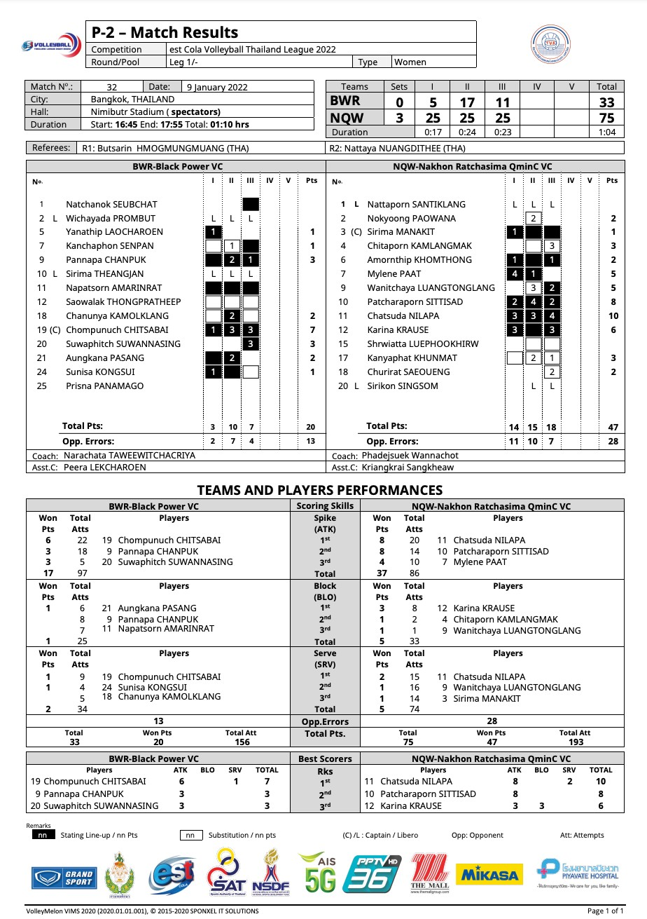 เอสโคล่า วอลเลย์บอลไทยแลนด์ลีก 2021-2022 เลก 1 ใบคะแนนสถิติผู้เล่น P-2 (ทีมหญิง) ประจำวันที่ 12 มกราคม 2565 (ย้ายมาแข่งที่อาคารนิมิบุตร) นครนนท์ - แบล็กพาวเวอร