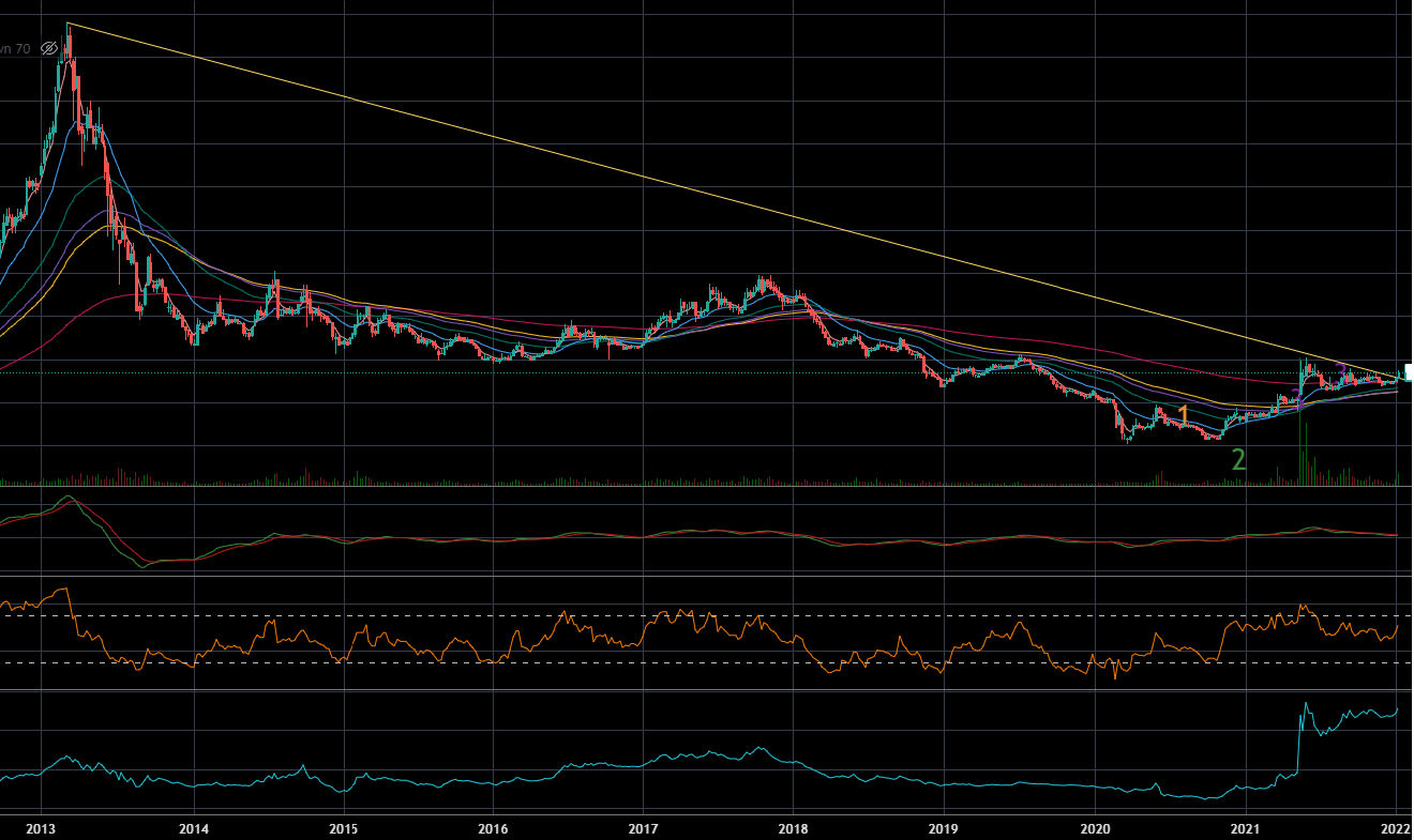 เมื่อเส้น EMA 10 สัปดาห์ (สีน้ำเงิน) ตัดขึ้นกับ EMA 200 สัปดาห์ (สีแดง) ในสัปดาห์แรก มันเพิ่งเริ่มต้นของการขึ้นรอบใหญ่ของหุ้นตัวนั้นๆ คุณต้องซื้อมัน แล้วคุณจะรวย อย่าไปสนใจว่าราคามันขึ้นมาเยอะแล้ว ถ้า