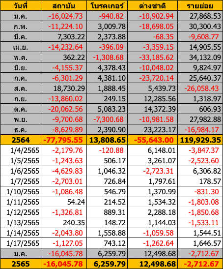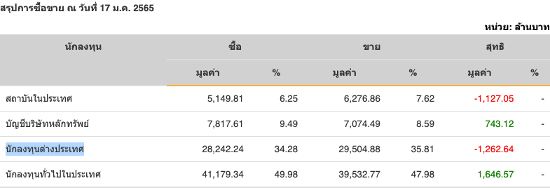 Sinthorn Summary : 17/1/2565 : ต่างชาติขายสุทธิ -1,262.64 ลบ.