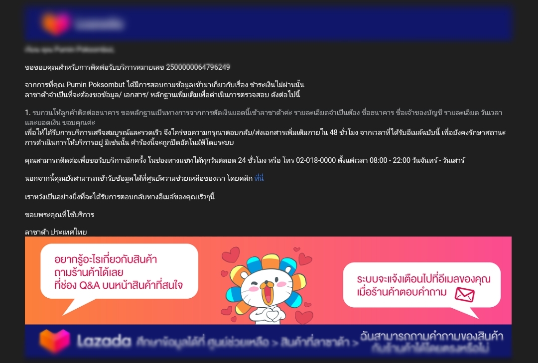 เนื่องจากวันที่ 11 ผมได้มีการสั่งซื้อของไป ระบบตัดเงินจากธนาคารแล้ว เวลาตี 1.46 ก็เรียบร้อย ในระบบขึ้นรอชำระเงิน ผมก็คิดว่าเดี๋ยวคงขึ้นว่าชำระเงินแล้วปกติ แต่มาตอนเช้าก็ยังขึ้นรอชำระเงิน ก็เลยทำการแจ้งกับทาง Lazada ไปทันที ทาง Lazada ก็ขอข้อมูลต่างๆ ผมก็ให้ไปทั้งหมด บอกให้รอ 1-2 วันในการตรวจสอบ