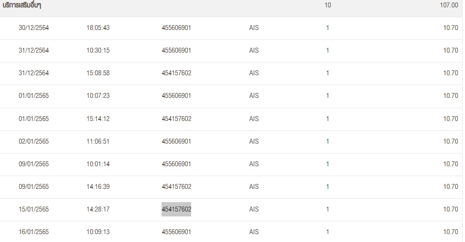 โทรศัพท์ระบบ AIS โดนกินจากเบอร์ 455606901 กับ 454157602 ครั้งละ 10.70 บาท