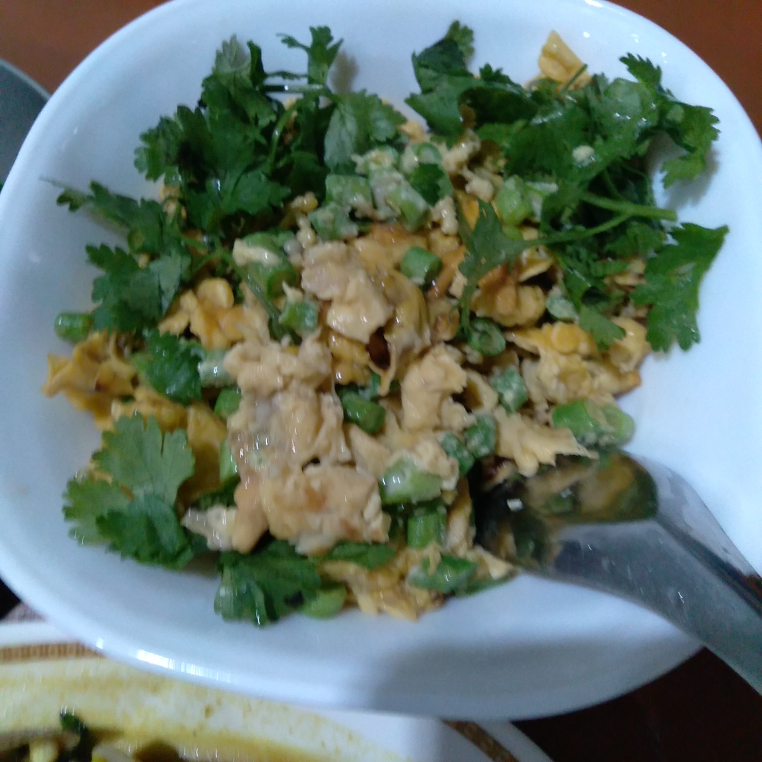 - ถั่วฝักยาวซอยผัดไข่ไก่ โรยหน้าผักชี