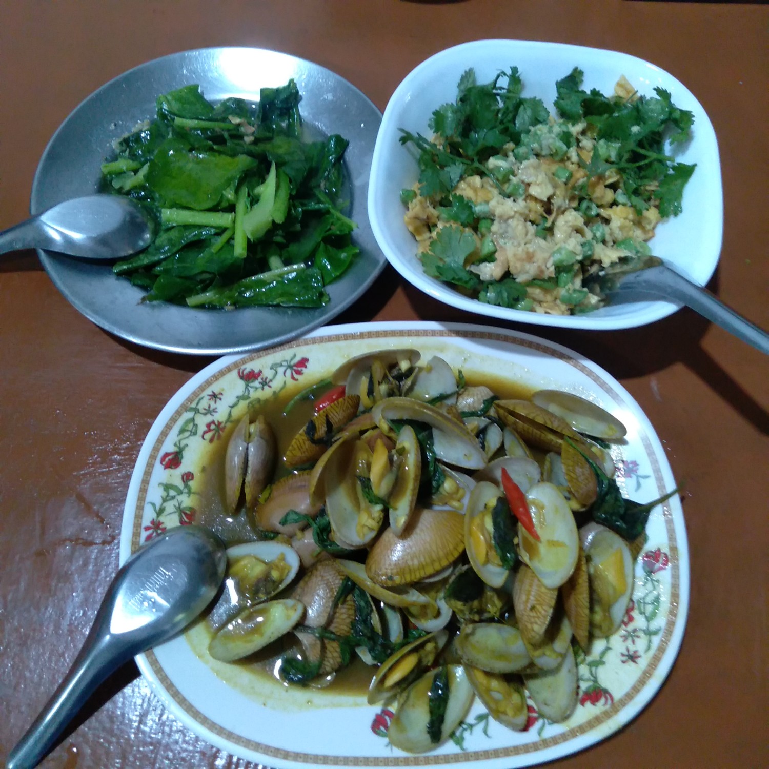 - ผัดหอยลาย ผงกะหรี่ ใบโหระพา พริกสดไม่แกะเม็ดพริกออก เน้นเผ็ด