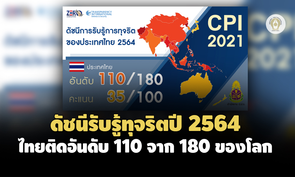 ป.ป.ช.เผยแพร่ดัชนีรับรู้ทุจริตประจำปี 64 ไทยได้ 35 คะแนน อยู่ที่อันดับ 110 จาก 180 ประเทศทั่วโลก