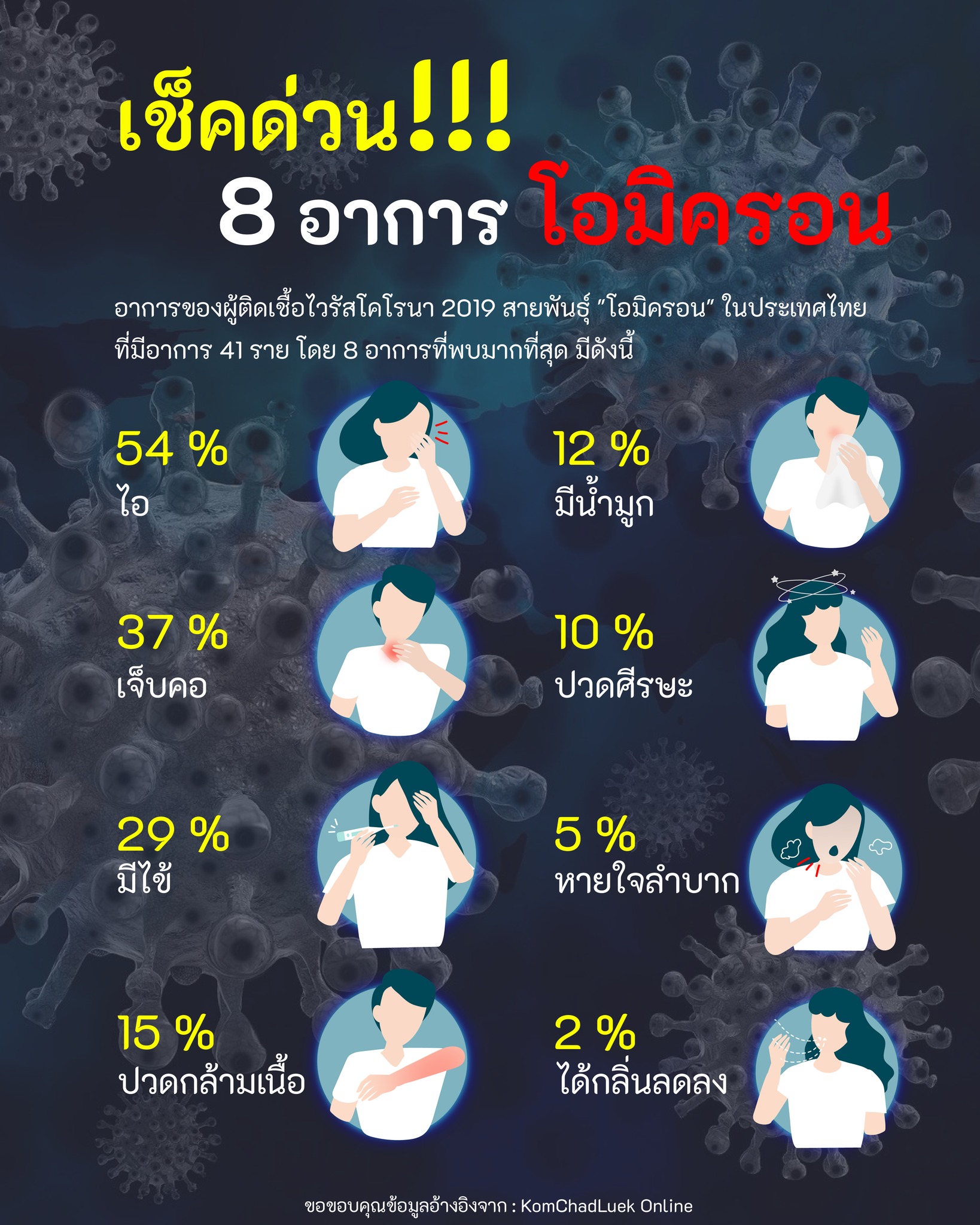 8 อาการโควิดสายพันธุ์ "โอมิครอน" ที่พบมากที่สุดจากผู้ติดเชื้อจะแสดงอาการอย่างไรบ้าง โดยพญ.อภิสมัย ศรีรังสรรค์ ผู้ช่วยโฆษกศูนย์บริหารสถานการณ์โควิด-19 หรือ ศบค. เปิดเผยข้อมูลอาการของผู้ติดเชื้อไวรัสโคโรนา 2019 สายพันธุ์ "โอมิครอน" ในประเทศไทย ที่มีอาการ 41 ราย โดย 8 อาการที่พบมากที่สุด มีดังนี้