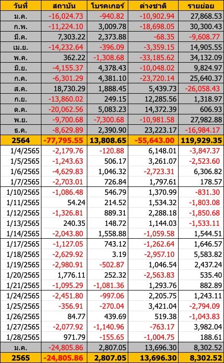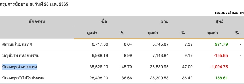 Sinthorn Summary : 29/1/2565 : ต่างชาติขายสุทธิ -1,004.75 ลบ.