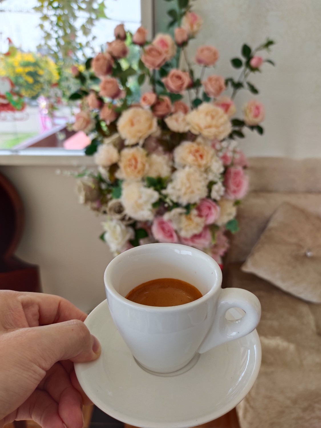 เอสเปรสโซ่ร้อน แก้วละ 40.- บาท เสิร์ฟมาพร้อมกับน้ำเปล่า