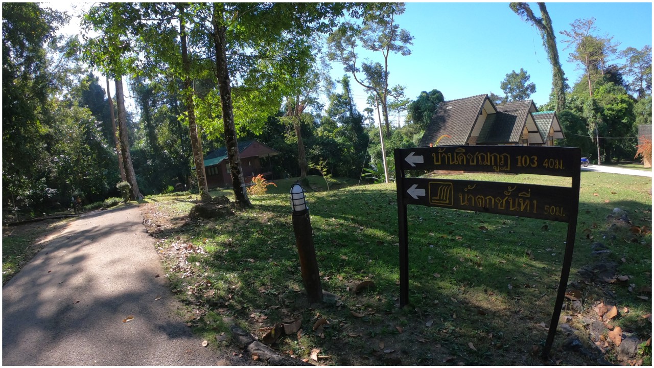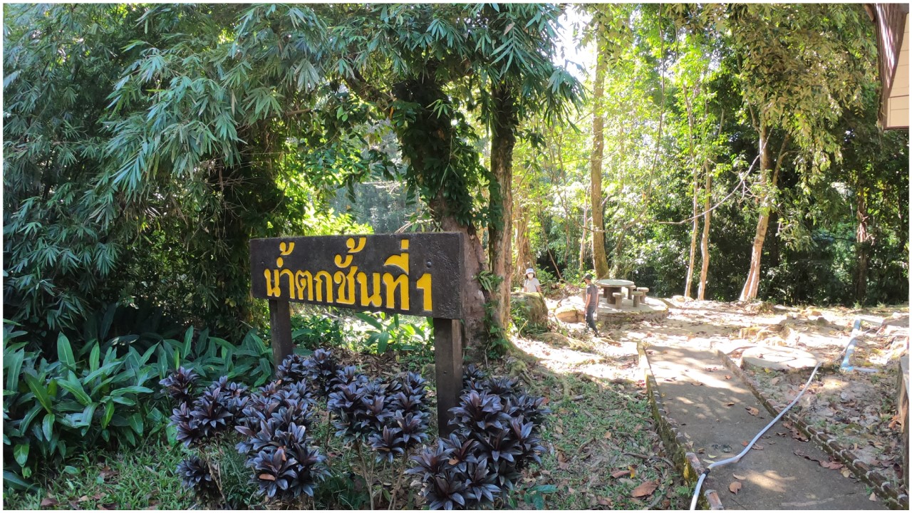 เดินจากห้องน้ำด้านหน้ามาไม่ไกล ก็เจอป้ายทางไปน้ำตกชั้นที่ 1 ระยะทางใกล้ๆ แค่ 50 เมตร