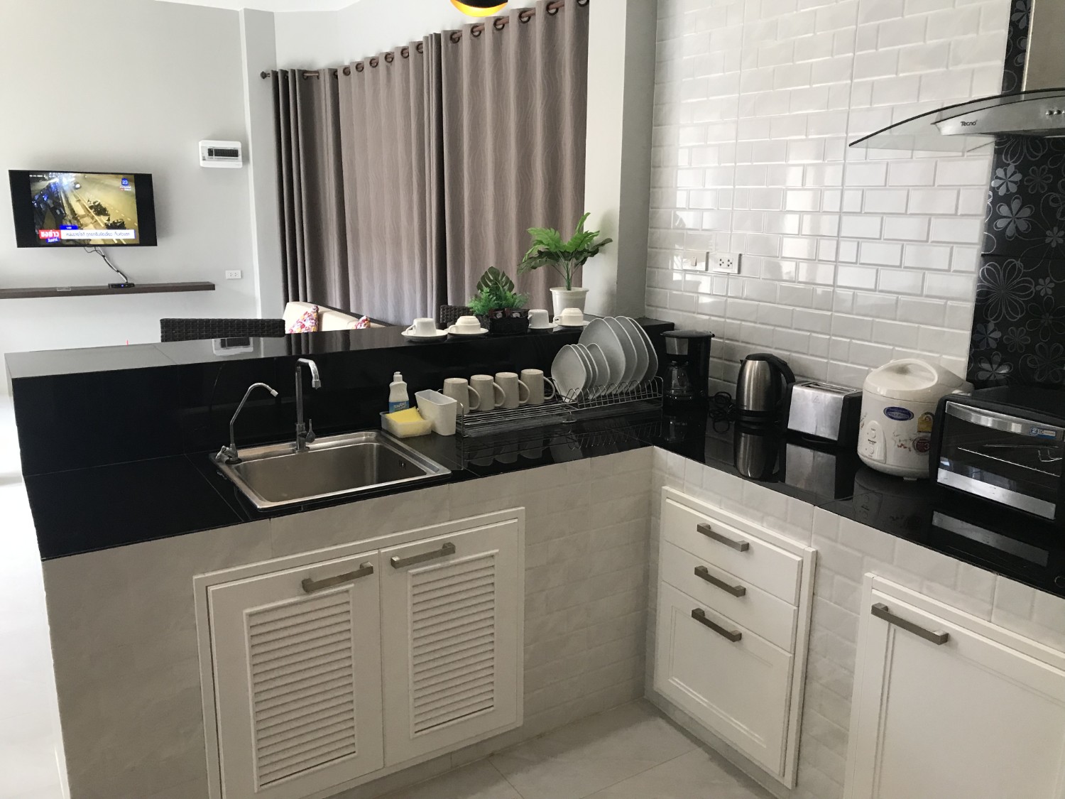 มีทั้ง โต๊ะกินข้าว จาน อุปกรณ์ทำครัว เตาไฟฟ้า เครื่องดูดควัน หม้อหุงข้าว ไมโครเวฟ กาน้ำร้อน เครื่องชงกาแฟ ตู้เย็น เครื่องซักผ้า