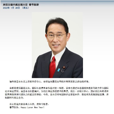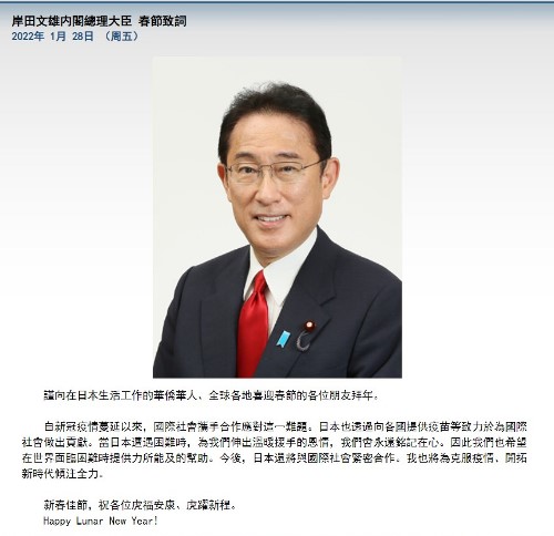 สำนักนายกรัฐมนตรีญี่ปุ่นเผยแพร่คำอวยพรตรุษจีนของนายกฟูมิโอะ คิชิดะ โดยมีทั้งรูปแบบอักษรตัวย่อที่ใช้ในจีนแผ่นดินใหญ่ และอักษรตัวเต็มที่ใช้ในไต้หวัน ซึ่งเป็นครั้งแรก เพราะในอดีตผู้นำญี่ปุ่นจะอวยพรตรุษจีนโดยใช้อักษรจีนตัวย่อเท่านั้น
