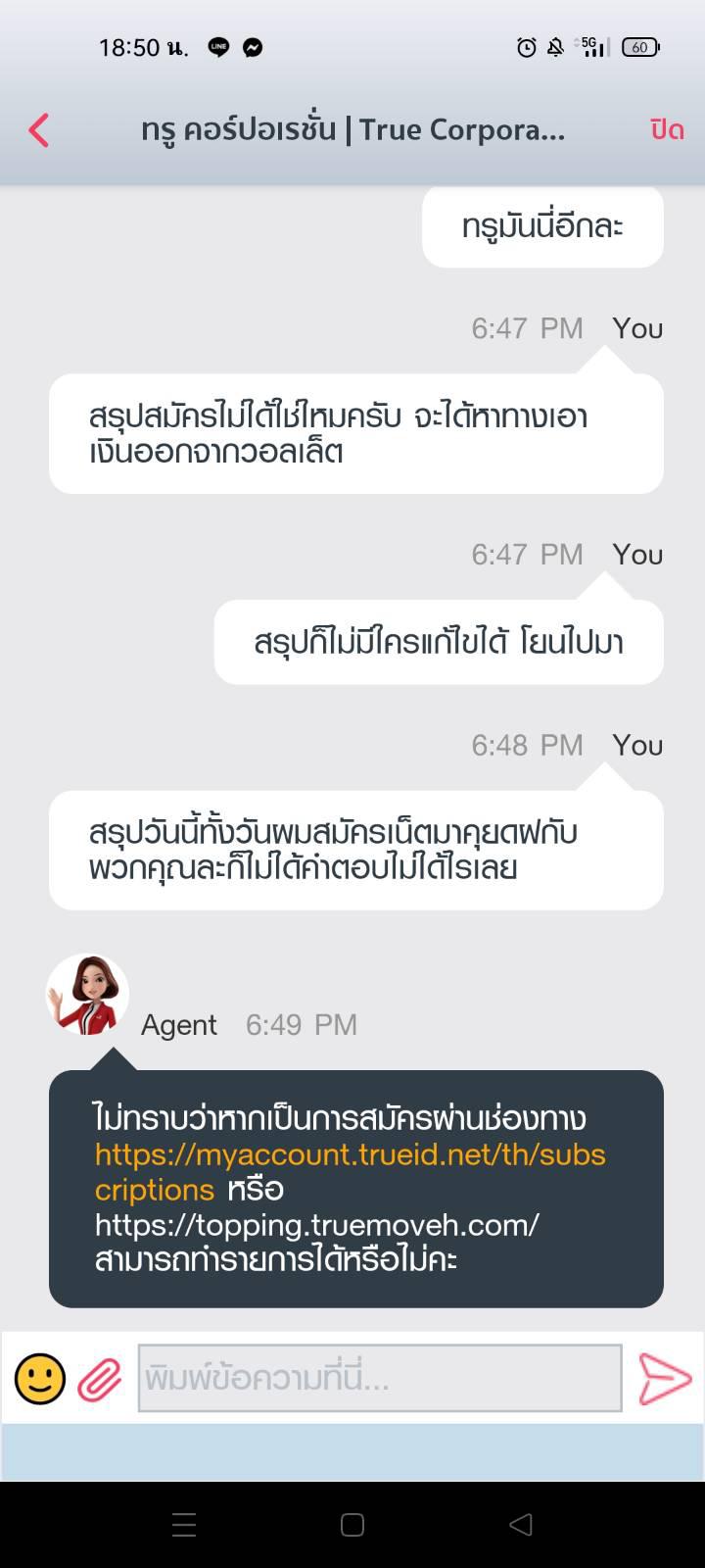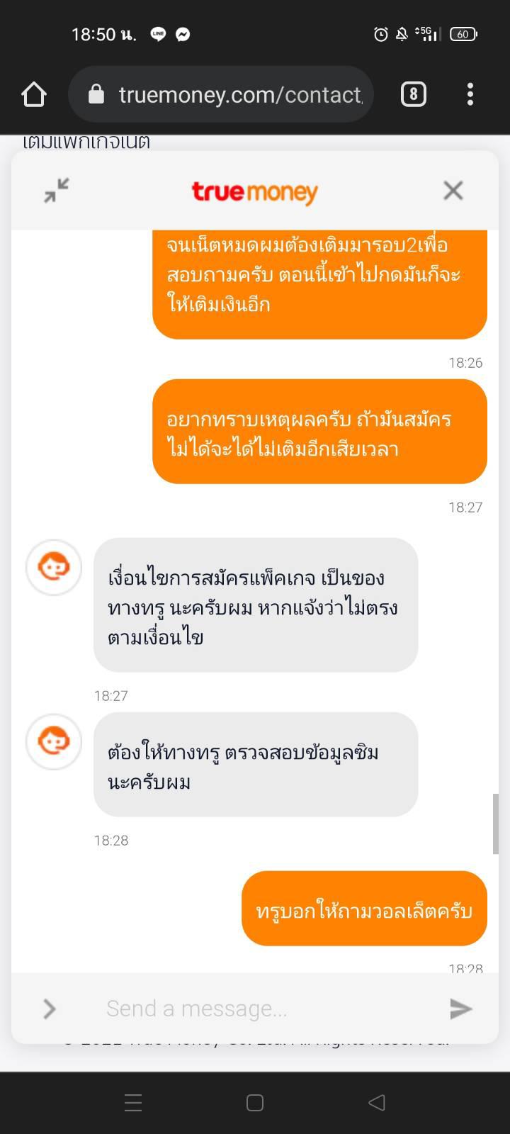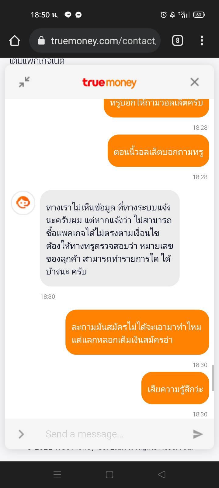 เรื่องของเรื่องมีอยู่ว่าเราซื้อเน็ตจากวอลเล็ต มูลค่า900บาทรวมภาษีอีก63บาท เราก็เติมเงินเข้าวอลเล็ตทำการสมัครแต่ไม่ได้ พอทำไปมาจนเน็ตหมดไป2รอบเติมเพิ่มอีกรอบละ25บาท ก็ยังสมัครไม่ได้ ทักไปหาทรูมูฟบอกติดต่อวอลเล็ต พอทักไปหาวอลเล็ตบอกติดต่อทรู คืออะไรครับสรุกโยนไปมาได้ความว่า วอลเล็ตเอาโปรหมดอายุตั่งแต่พฤษภามาขาย ความรู้สึกคือเหมือนหลอกให้เติมเงินเข้าไปในระบบ เลยอ่าไม่มีแล้วเอามาขึ้นเสนอขายได้ไงละ สรุปหมดเงินเพิ่มอีก20บาทเพื่อโอนเงินกลับเข้าธนาคาร ทำให้เสียทั้งเวลา เสียทั้งเงินอีก70บาท ทั้งที่ไม่ความจะเสียแต่แรก ถ้ารู้ว่าสมัครไม่ได้ก็จะได้เอา70บาทนี่ไปสมัครตัวอื่น แย่มาก สรุปย้ายข่ายไปAIS ตอนนี้กำลังดูโปรอยู่ เลือกความจ่ายเงินสดใน7-11แทนละกันลาก่อนทั้ฃวอลเล็ตทั้งทรู