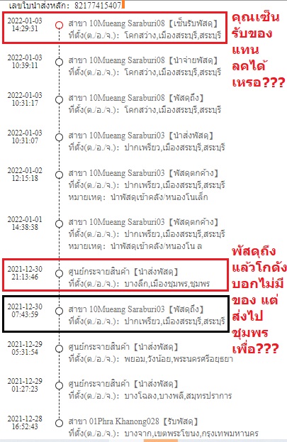 1. วันที่ 30 ธค ลครีบใช้เพราะกลัวข้ามปี จึงไปรับของที่โกดังเพราะสถานะของถึงแล้ว แต่โกดังแจ้งว่าของไม่ถึงทั้งที่สถานะบนระบบถึงแล้ว เราติดต่อ call center รับแจ้งว่าของถึงแล้วจริง แต่อาจจะเกิดความผิดพลาด จะประสานโกดังให้แยกของไว้ ลคไปรับที่โกดังได้เลย ปรากฏว่าลคไปรับของอีกครั้ง ทางโกดังสระบุรีแจ้งว่าของไม่ถึง เราตรวจสอบสถานะในระบบพบว่าของถูกส่งไปชุมพร ทั้งๆ ที่ปลายทางสินค้าคือสระบุรี