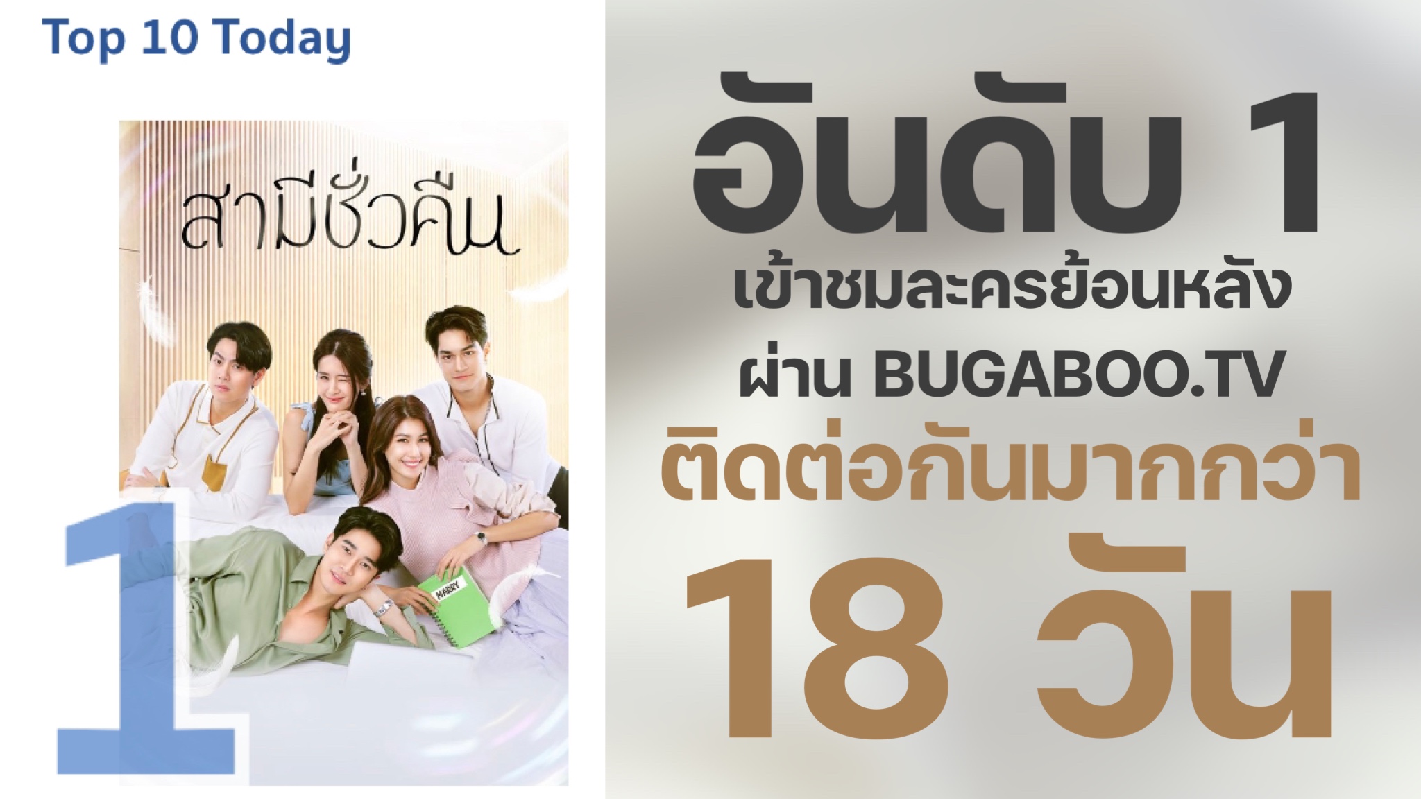 นอกจากนี้ ‘สามีชั่วคืน’ ยังมาแรงจนติดอันดับ 1 ของผู้เข้าชมละครย้อนหลังใน BUGABOO.TV ติดต่อกันมากกว่า 18 วัน