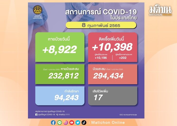 หายป่วยกลับบ้าน 8,922 ราย หายป่วยสะสม 232,812 ราย (ตั้งแต่ 1 มกราคม 2565) ผู้ป่วยกำลังรักษา 94,243 ราย และเสียชีวิต 17 ราย
