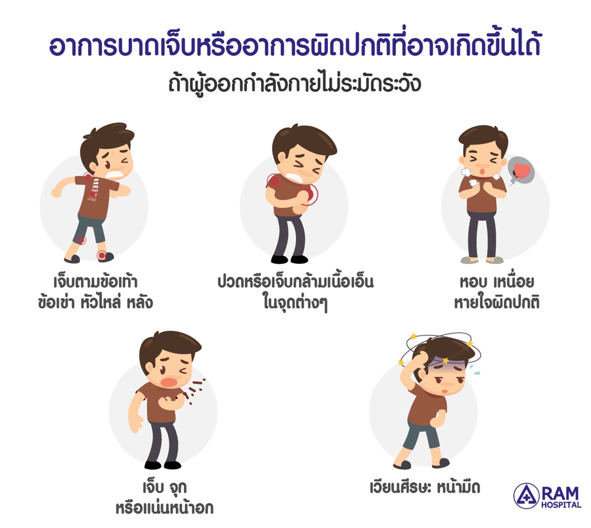 อาการบาดเจ็บหรืออาการผิดปกติเหล่านี้อาจจะเกิดขึ้นได้ถ้าผู้ออกกำลังกายไม่ระมัดระวัง เช่น