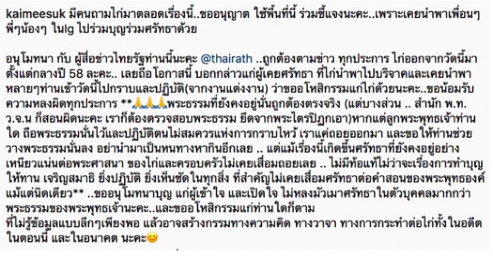 “เป็นสาวสายบุญที่ชอบเข้าวัด และจัดกิจกรรมเข้าวัดให้แก่พุทธศาสนิกชนอยู่เสมอ...”...สาว “ไก่” ต้องออกมาเผยว่า น้อมรับความหลงผิดทุกประการ เคยพาคนไปทำบุญที่นี่จริง แต่ได้ออกจากวัดนี้ตั้งแต่ปี 2558 และขออโหสิกรรมจากคนที่เคยพาไปวัดแห่งนี้ด้วย