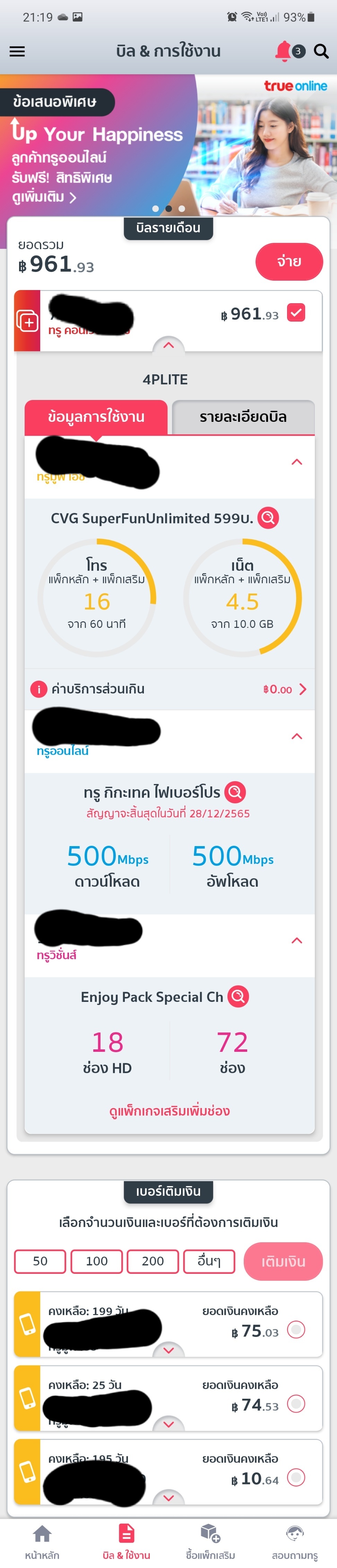 โปร 899 เน็ต 500/500 โทรฟรี 60นาที เน็ต 10gb ทรูวิชั้นเอ็นจอย