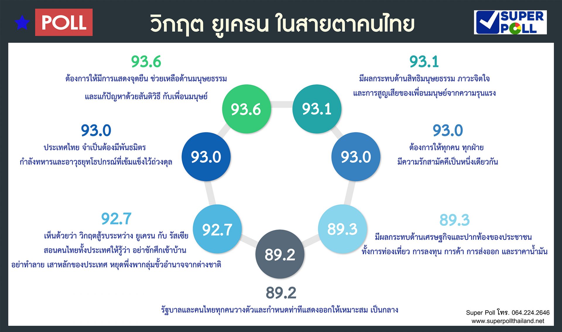 ที่น่าสนใจส่วนใหญ่มีความกังวล คือ ร้อยละ 93.1 ระบุ ด้านมนุษยธรรม ภาวะจิตใจและการสูญเสียของเพื่อนมนุษย์จากความรุนแรง ร้อยละ 92.9 ระบุด้านเศรษฐกิจ จากราคาพลังงานและวัตถุดิบที่สูงขึ้น กระทบต้นทุนการผลิต ร้อยละ 92.4 ระบุ ด้านความมั่นคง อาจขยายเป็นสงครามขนาดใหญ่ ที่มีผลกระทบต่อสภาพแวดล้อมความมั่นคงและวิถีชีวิตซ้ำเติมโควิด ร้อยละ 91.6 ระบุ ด้านการเมืองระหว่างประเทศ การแทรกแซงและถูกบังคับให้เลือกข้าง และร้อยละ 89.3 ระบุ ด้านเศรษฐกิจและปากท้องของประชาชน ทั้งการท่องเที่ยว การลงทุน การค้า การส่งออก และราคาน้ำมัน เป็นต้น