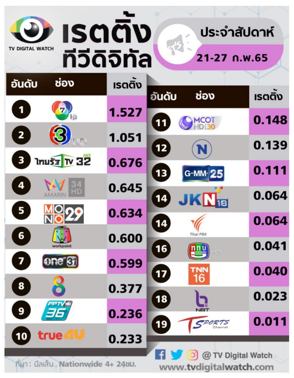 🔎 เรตติ้งทีวีดิจิทัล ประจำสัปดาห์ 14-20 ก.พ. 65 : เรตติ้งช่องปรับตัวดีขึ้น