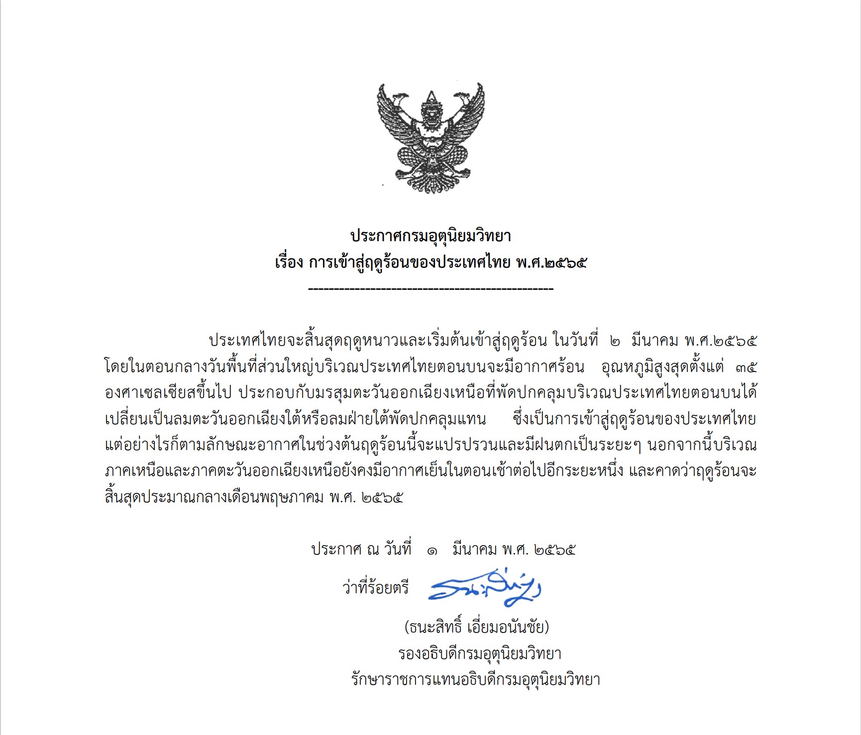 ประเทศไทยเข้าสู่ฤดูร้อนปี 2565 แล้ว โดยปีนี้อากาศจะไม่ร้อนมากนัก