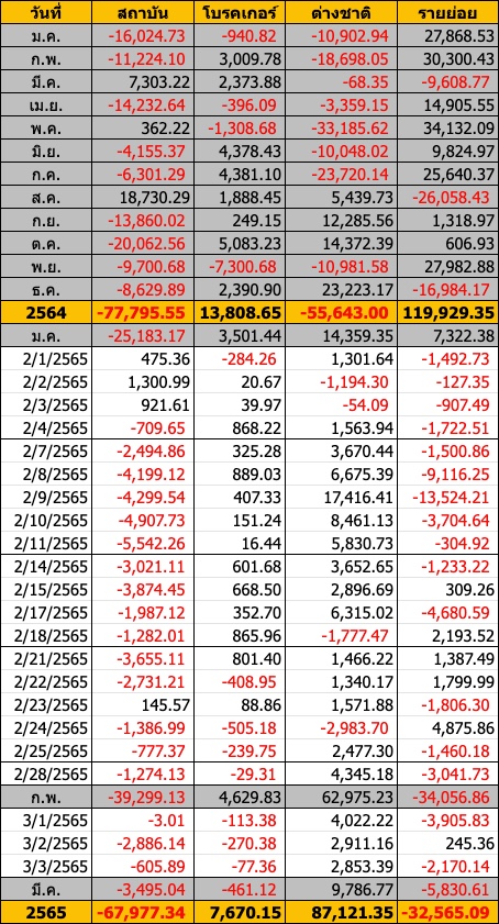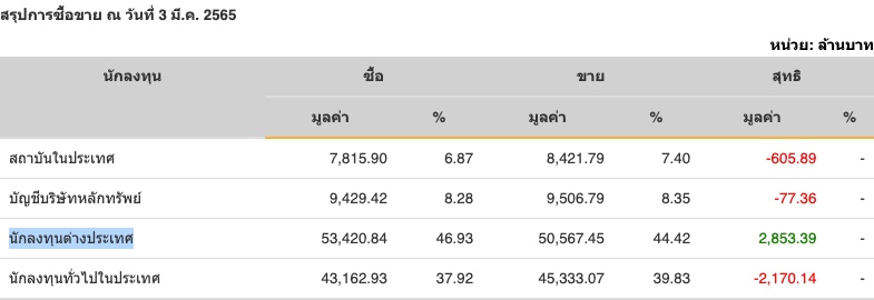Sinthorn Summary : 3/3/2565 : ต่างชาติซื้อสุทธิ 2,853.39 ลบ.