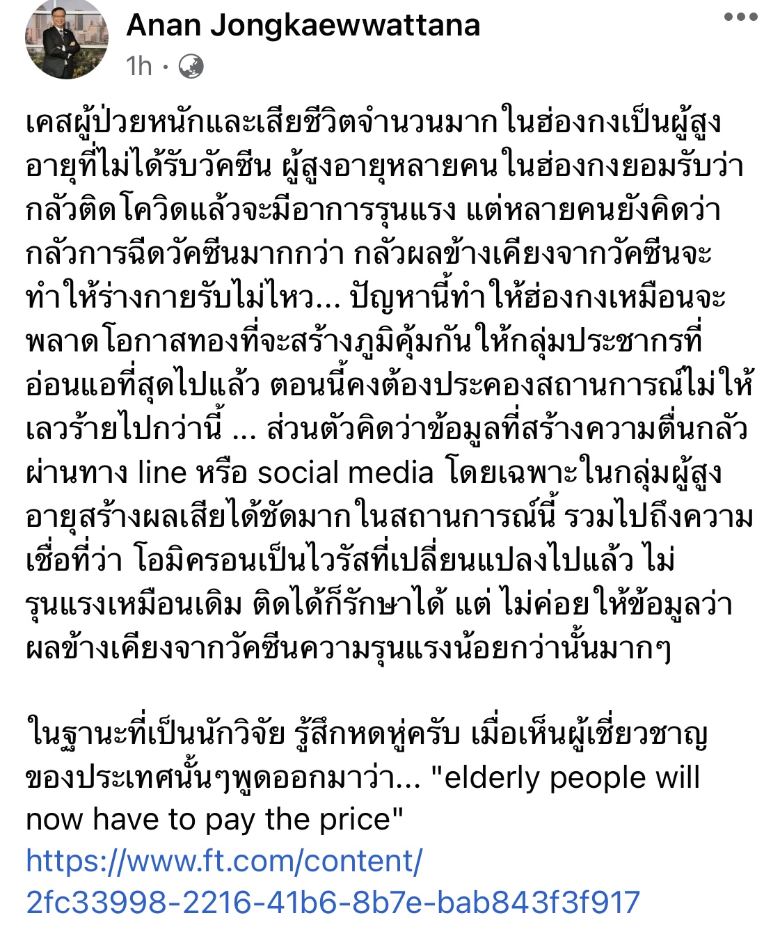 จาก FB ดร อนันต์ครับ : https://www.facebook.com/100000897943637/posts/5511511038888773/?d=n การศึกษาจาก Oxford วัคซีนช่วยลดความเสี่ยงป่วยหนัก , death แต่อาจไม่ลดความเสี่ยง Long Covid