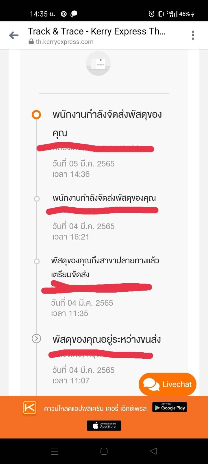จริงๆพัสดุขึ้นระหว่างนำส่งมา 2 วันแล้ว ควรถึงตั้งแต่เมื่อวานแล้ว แต่เมื่อวานฝนตกหนัก น้ำท่วม ก็เข้าใจว่าอาจไม่สะดวกมาส่ง และวันนี้ก็ขึ้นว่าจะนำมาส่งให้อีกครั้ง (05/10/68) แต่พอดีไม่อยู่ห้องและไม่ได้รั