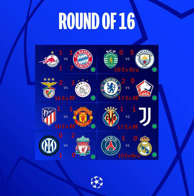 จากภาพ ตัวเลขข้างบนคือผลการแข่งขันเลกแรกตัวเลขข้างล่างคือผลการแข่งขันเลกสอง/กำหนดเวลาแข่ง