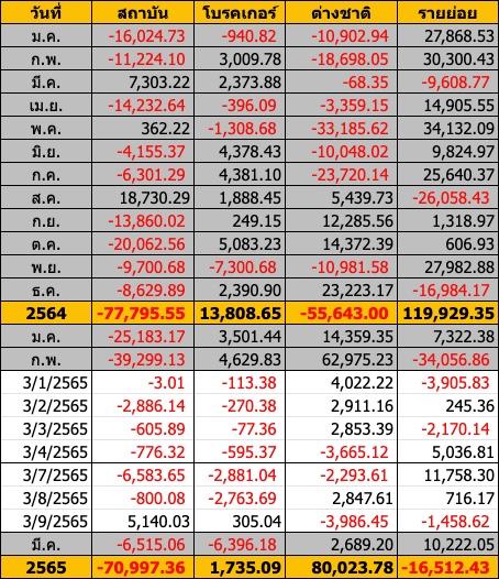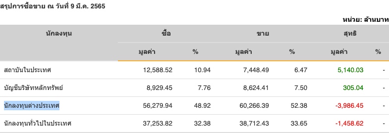 Sinthorn Summary : 9/3/2565 : ต่างชาติขายสุทธิ -3,986.45 ลบ.