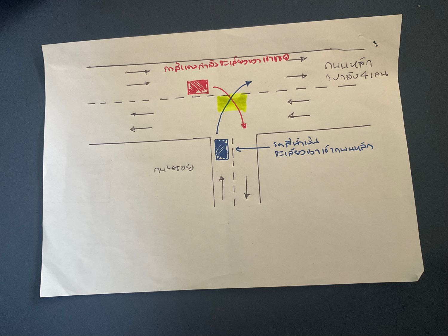 ตามรูปลเยนะครับ รถคันสีน้ำเงินกำลังจะเลี้ยวขวาออกจากซอยเข้าถนนหลัก ในขณะที่รถสีแดงอยู่บนถนนหลักกำลังเลี้ยวเข้าซอย แล้วเกิดชนกันตรงสีเหลือง
