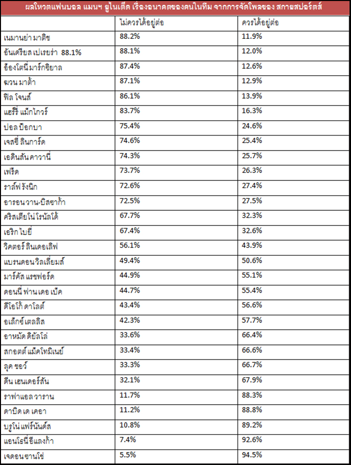 ทั้งนี้ มีแฟนบอลราว 67.7% ที่โหวตว่า โรนัลโด้ ควรโดนโละ ขณะที่ในรายของ แม็กไกวร์ มีแฟนบอลมากถึง 83.7% ที่ไม่อยากเห็นเขาอยู่กับทีมต่อ ส่วน ป็อกบา โดนโหวตให้ออกจาก โอลด์ แทร็ฟฟอร์ด มากถึง 75.4% เลยทีเดียว นอกจากนี้ ราล์ฟ รังนิก ก็ยังมีคนโหวตถึง 72.6% ว่าไม่ควรได้ทำงานในฐานะผู้จัดการทีมต่อไปหลังจบฤดูกาลนี้เช่นกัน แต่ยังไงซะ รังนิก ก็จะก้าวขึ้นไปเป็นที่ปรึกษาของทีมตั้งแต่ฤดูกาลหน้าอยู่แล้ว
