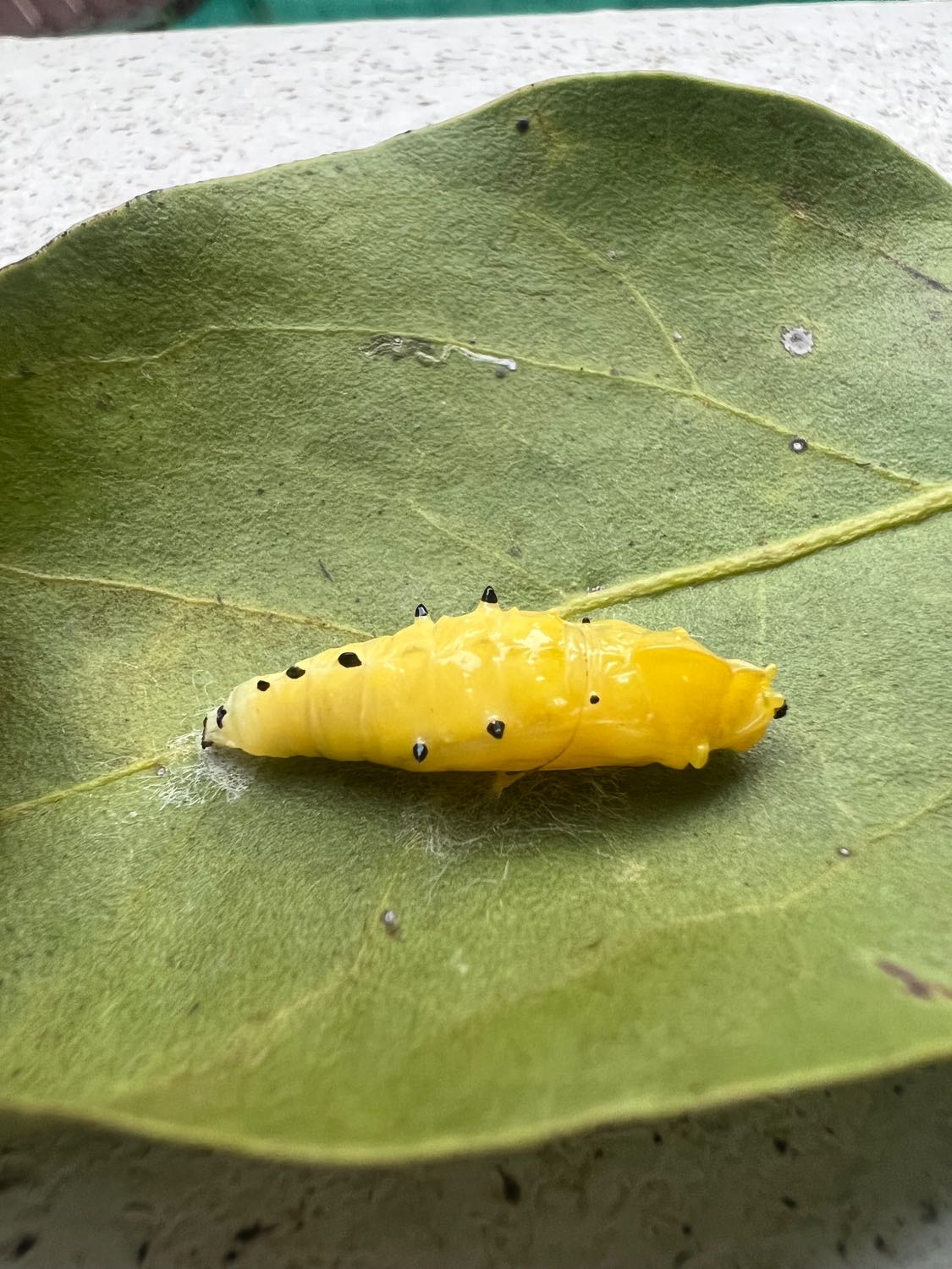 พอดีใบไม้นี้หล่นลงมาที่สนามหญ้าไม่ทราบว่านี่คือดักแด้ของผีเสื้อชนิดไหนคะแล้วถ้ามีตัวอยู่ในนั้น