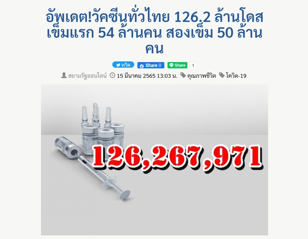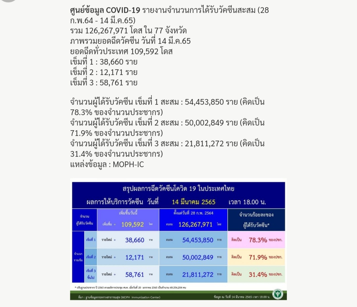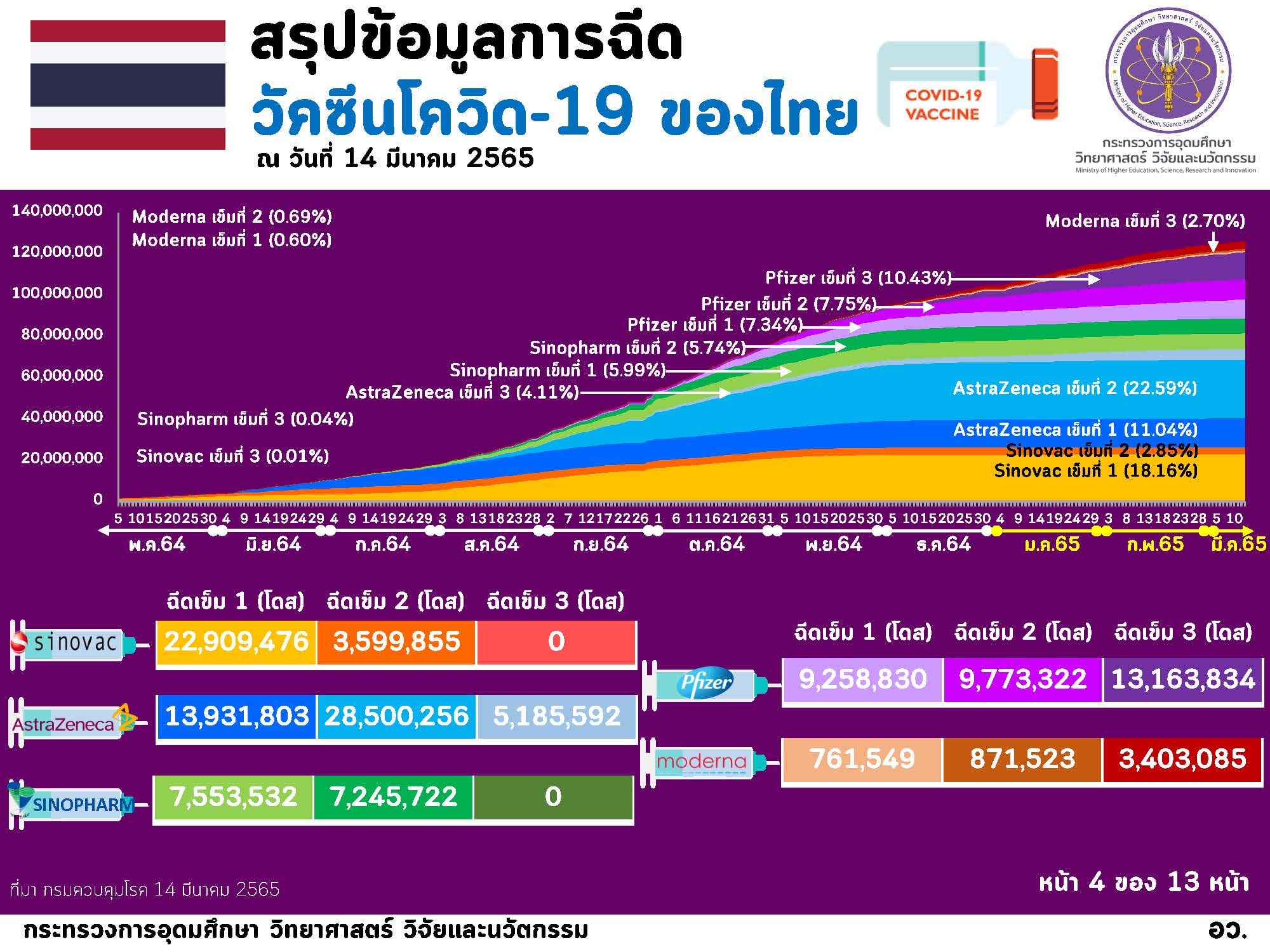 1) ข้อมูลการฉีดวัคซีนล่าสุดของประเทศไทย ณ วันที่ 14 มีนาคม 2565