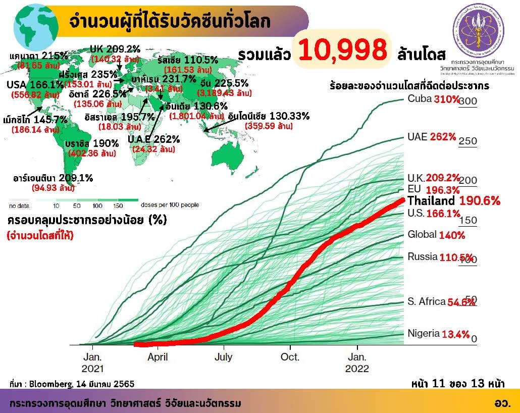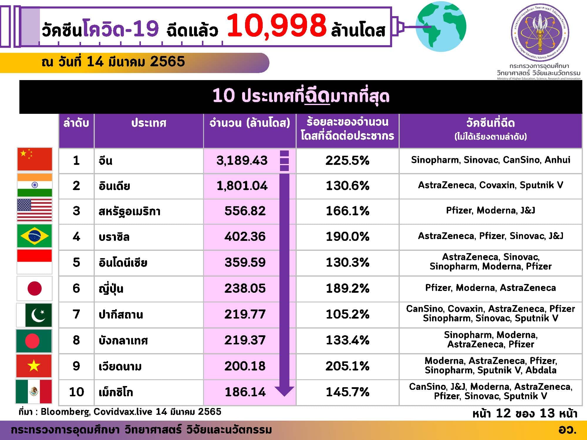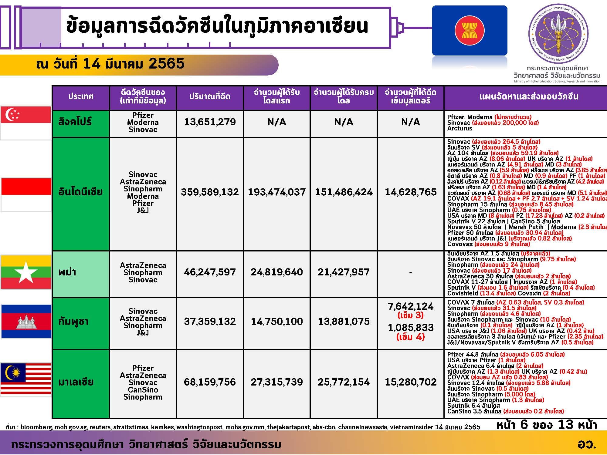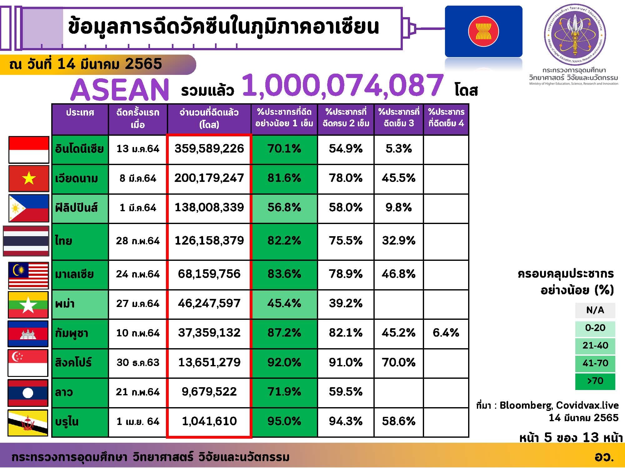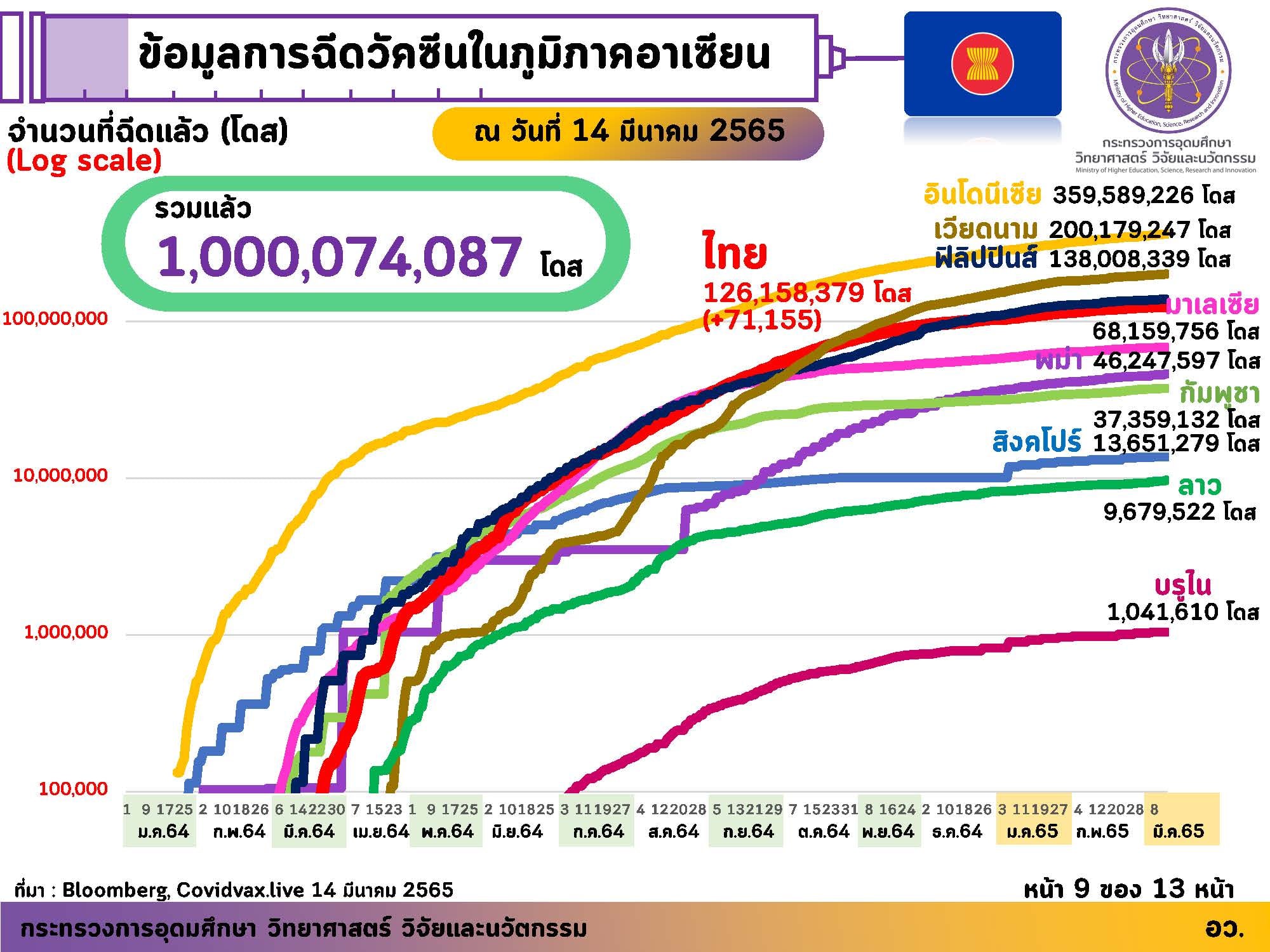 "อว. เผยฉีดวัคซีนของไทย ณ วันที่ 14 มีนาคม 2565 ฉีดวัคซีนแล้ว 126,158,379 โดส และทั่วโลกแล้ว 10,998 ล้านโดส ใน 205 ประเทศ/เขตปกครอง ส่วนอาเซียนฉีดแล้วทุกประเทศ รวมกันกว่า 1,000.07 ล้านโดส