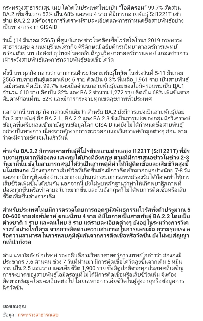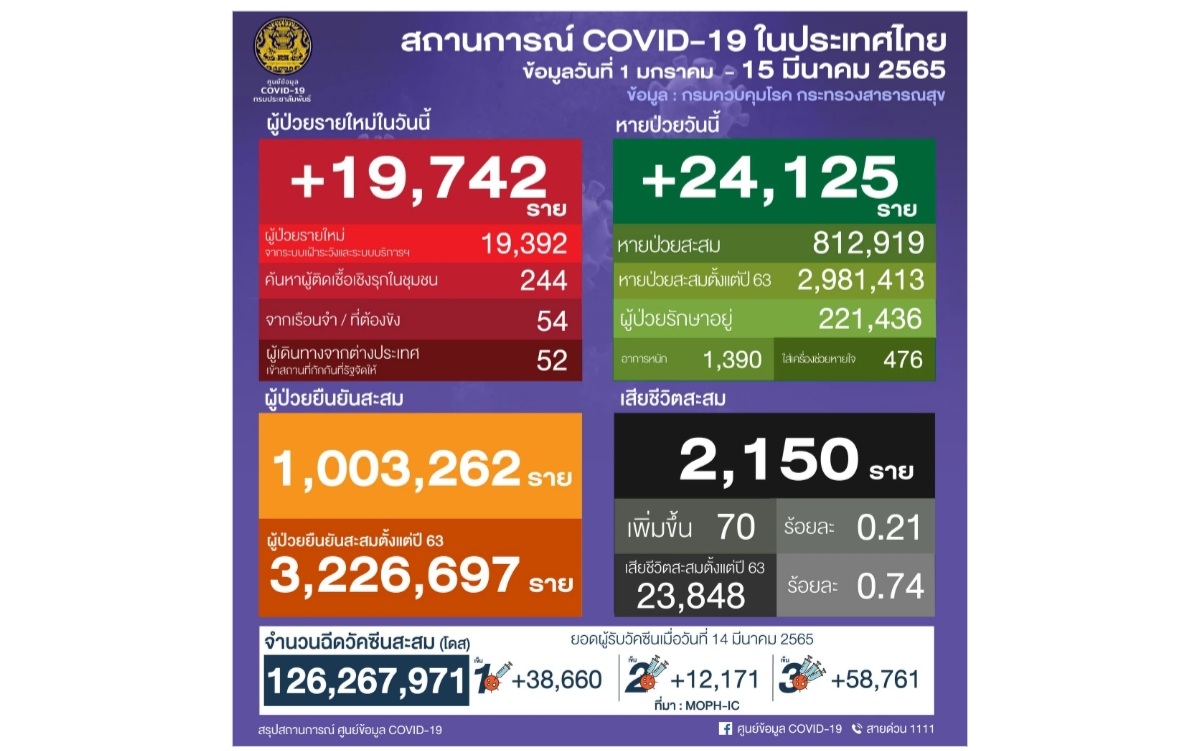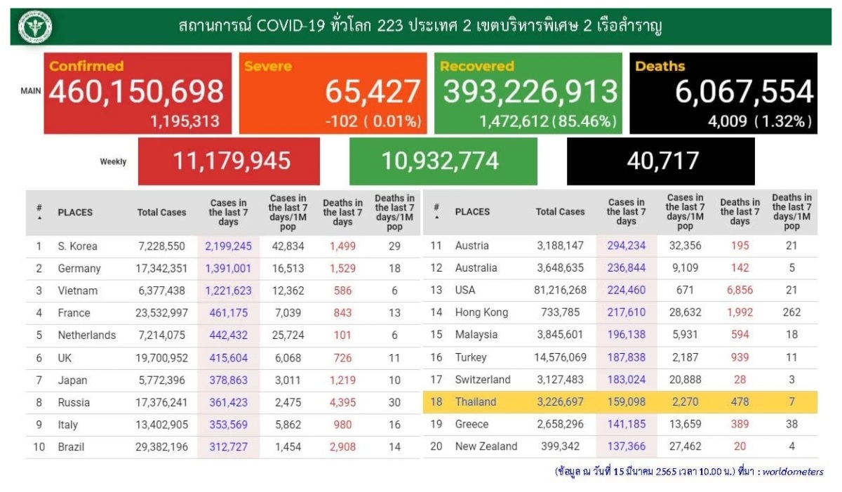 🇹🇭มาลาริน💗15มี.ค.ไทยไม่ติดTop10โลก/ป่วย19,742คน หายป่วย24,125คน ตาย70คน/BA.2.2ในไทย/ลุยฉีดวัคซีนSave 608 ลดตายทวีคูณ