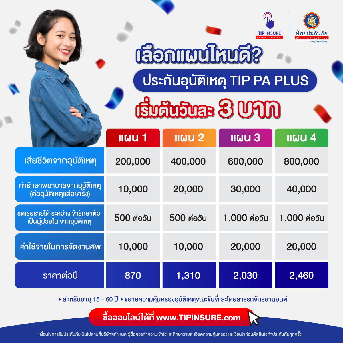 มาจนถึงตอนนี้นอกจากจะมาช่วยไขข้อสงสัยแล้ว ผมก็ยังมาขายของอีกด้วย! เอาหน่าลองอ่านดูสักนิดนะครับ ใครที่ยังไม่มีประกันอุบัติเหตุ ผมแนะนำประกันอุบัติเหตุ TIP PA Plus จากทิพยประกันภัย เบี้ยเบาๆ เริ่ม 870 บาท/ปีเท่านั้นเองครับ ลองดูแผนประกันที่ชอบในราคาที่ใช่กันได้เลยครับผม ด้วยความห่วงใยใส่ใจสุดๆ จากทิพยประกันภัยคร้าบบ เช็คราคาหรือซื้อออนไลน์ได้เลยที่