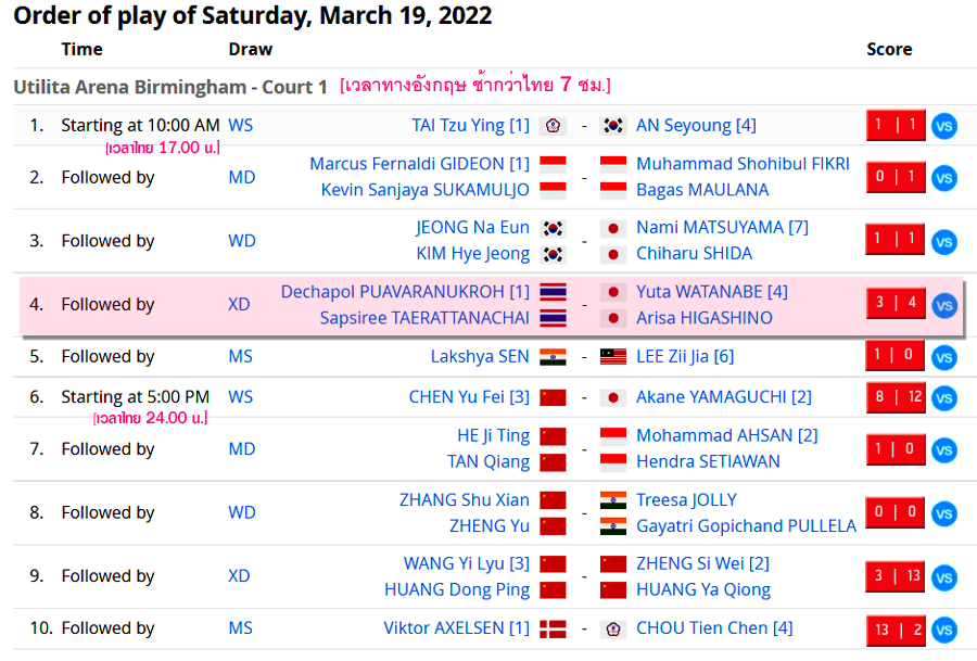 • ถ่ายทอดสด [TV Court 1] ทาง Youtube BWF TV เวลา 17.00 - 22.00 น. และ 24.00 - 05.00 น. (เช้า 20 มี.ค.65)