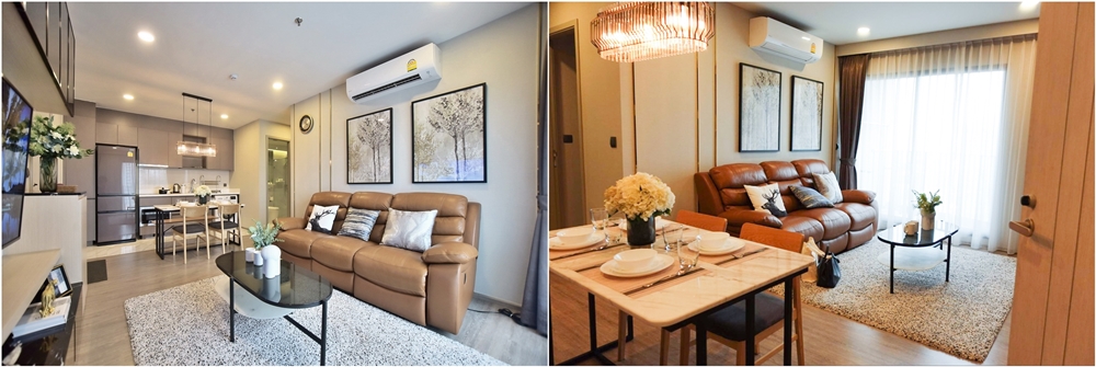 ดูส่วนกลางเสร็จก็ได้เวลาไปดูห้องของจริงแล้วจ้าา คอนโดห้องที่เราเลือกจะเป็นแบบ 2 ห้องนอน เปิดห้องมาคือแทบจะไม่ต้องตกแต่งอะไรเพิ่มเยอะเลย เจอห้องจริงคือสวยน่าอยู่มาก ส่วนนี้จะเป็นห้องนั่งเล่น / โซนห้องครัว