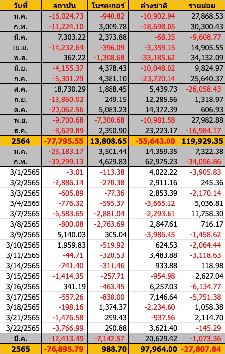 Sinthorn Summary : 22/3/2565 : ต่างชาติซื้อสุทธิ 3,621.40 ลบ.