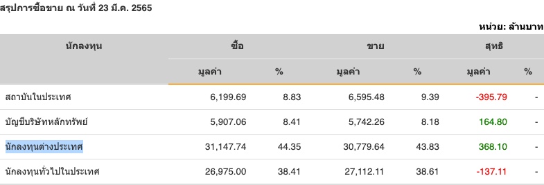 Sinthorn Summary : 23/3/2565 : ต่างชาติซื้อสุทธิ 368.10 ลบ.