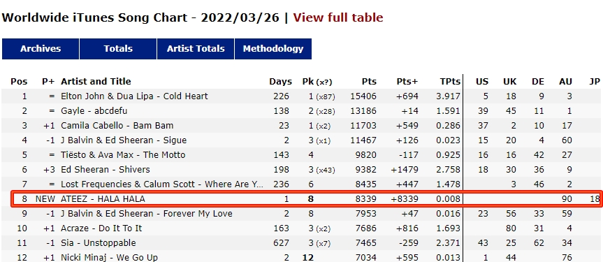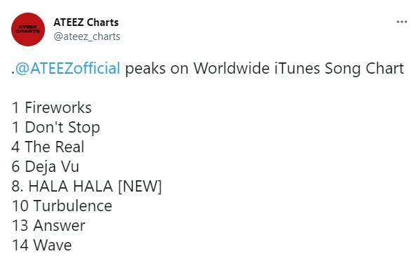 วันนี้เพลง HALA HALA (Hearts Awakened, Live Alive) ของ Ateez ซึ่งเป็นเพลง B-side track ของ Ateez ในอัลบั้ม TREASURE EP.2: Zero To One เมื่อปี 2019 ได้ขึ้นมาติดอันดับที่ 8 หรือติด TOP 10 ของ Worldwide iTunes Song Chart ได้เป็นครั้งแรก